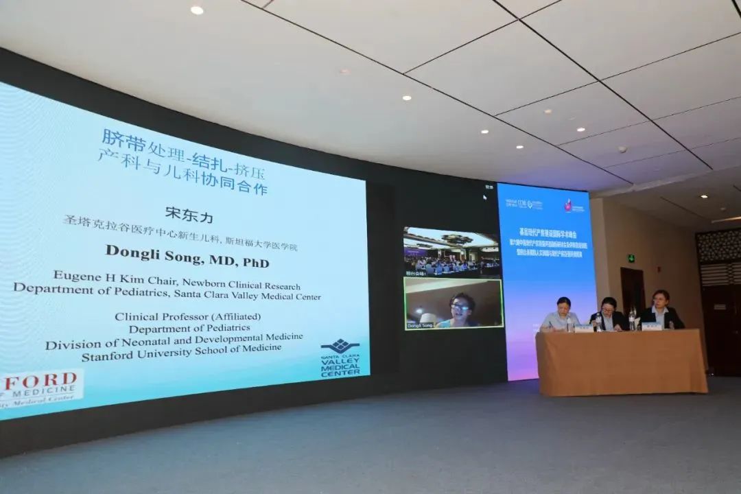上午第二阶段的峰会由桓台县妇幼保健院产科郑爱妮主任、耿艳芳主任、产房李爱红助产士长一起主持。斯坦福大学医学院宋东力教授以“延迟脐带节扎-产科与新生儿科的合作”为题讲述了胎盘输血/脐带挤压的益处。Novant Health Forsyth医学中心母胎医学专科陈凯医生线上介绍了美国的产房分级诊疗体系。美国哈佛大学麻省总院王景平教授讲授了麻省总院产房安全模拟人实训。
